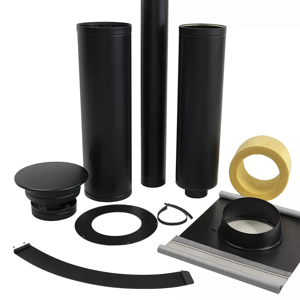 Med skorstenspakken modtager du en komplet løsning, der sikrer korrekt aftræk og lang holdbarhed. Skorstenen er fremstillet i stål og passer til brændeovne med Ø150 mm røgstuds.